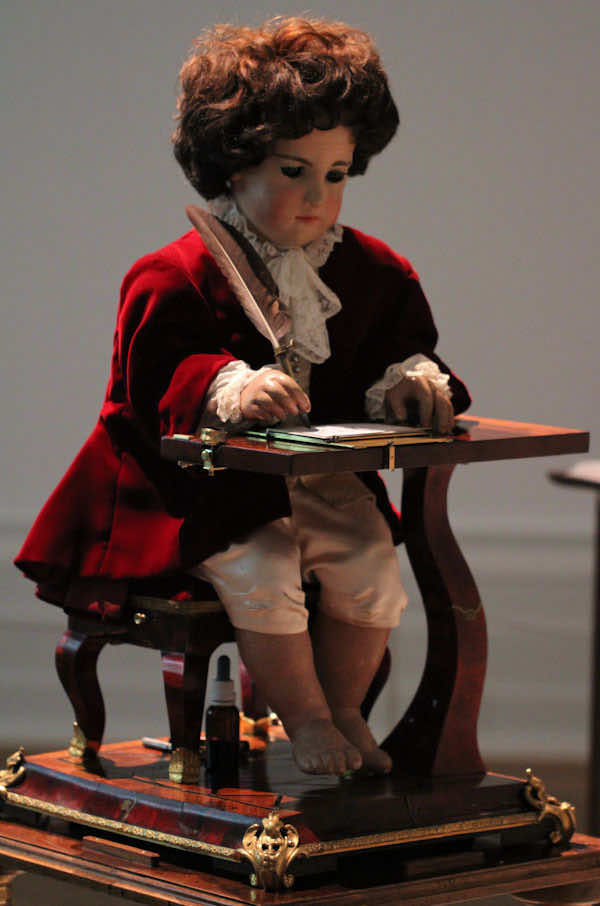 这是由皮埃尔Jacquet-Droz,瑞士手表制造商,在1770年代末,它仍然是纽夏特艺术和历史博物馆展出西伯尔尼,瑞士。小三岁的男孩用鹅毛羽毛很快地写在他的右手,他的眼睛跟他写什么,他甚至摇羽毛笔后浸在墨水罐子。作者是可编程的,因为它可以写任何文字多达40个字母。