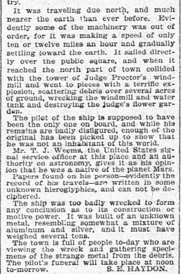 这就是令人毛骨悚然的地方,因为这张纸不是任何普通的文件。在德克萨斯州的奥罗拉,报纸报道了一起UFO坠毁事件,并写道,