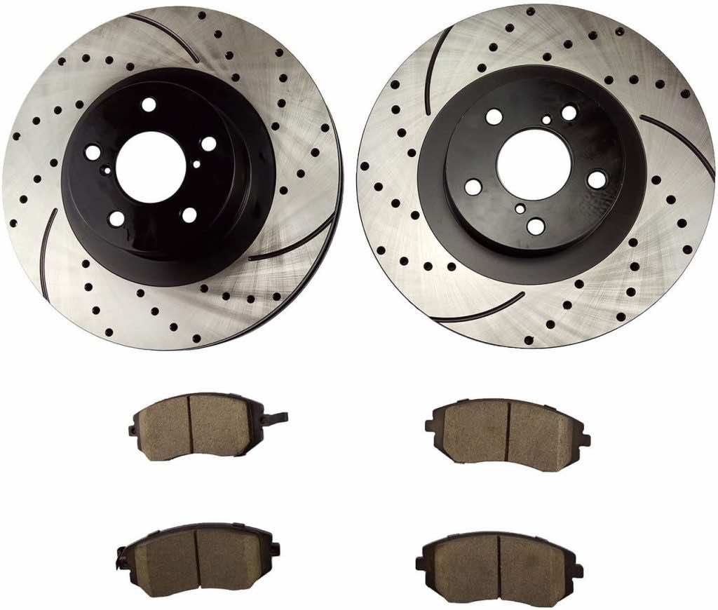 交叉钻孔和开槽转子促进空气流动,并有助于保持制动冷却在激烈的驾驶条件。陶瓷垫可以减少噪音、褪色和灰尘。这些非常容易安装,因为不需要修改。该包还包括两个前转子和前刹车片连同制动转子。