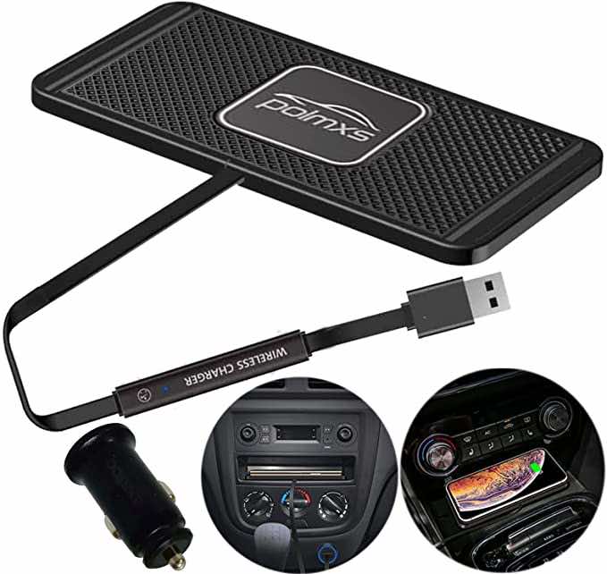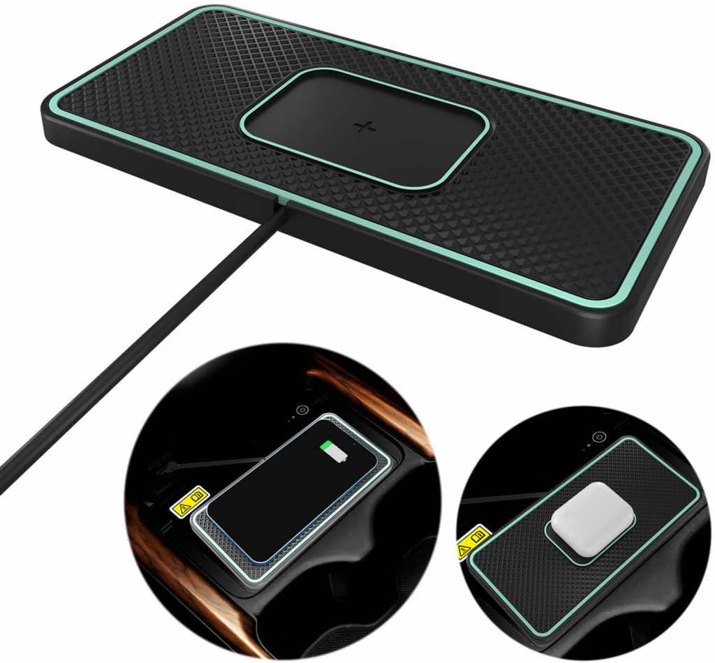作为清单的开始,我们有这些SANMIDO汽车充电器,需要10瓦的电力才能工作,可以安装在你的现代图森。这款产品在一个垫子的形状上为你的手机和空气舱无线充电。凹陷的部分用于空气舱充电,有两条发光条纹,帮助你在黑暗中定位设备。