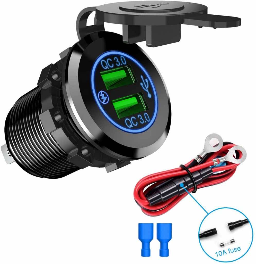 这是90°快速充电器和90°QC 3.0 USB端口在35分钟内为兼容设备充电高达80%,比标准充电器更快。这些充电器具有更高的安全标准,当有过充/过热/短路/过流/过压危险时,汽车分离器将自动停止工作,内置5A保险丝和智能IC。