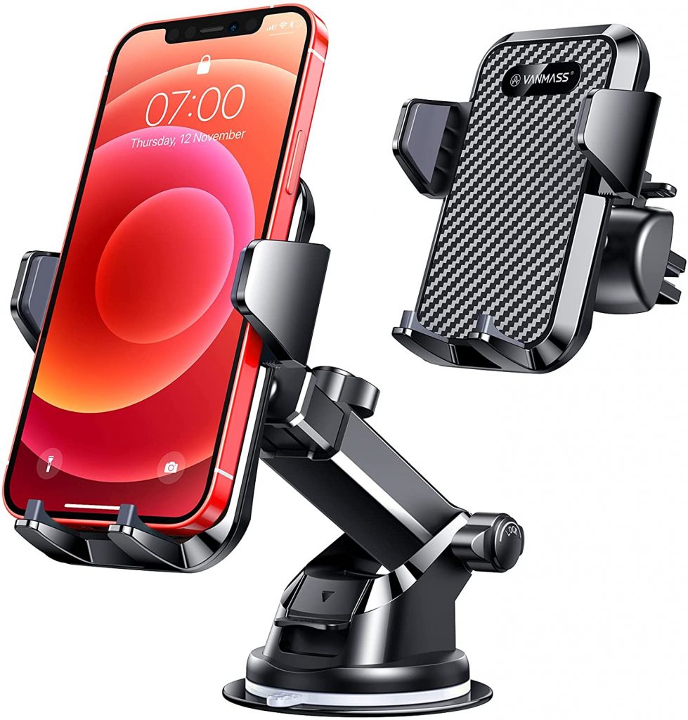 由于评分很高,VANMASS是亚马逊上最畅销的书籍之一。这是一套完整的安全和潮流设计。粘性吸盘和钢芯排气夹确保你的手机在颠簸中保持稳定。额外的衬垫增加了它的耐久性。它的另一个显著特点是底部的下拉托盘,可以容纳和承受手机的重量。