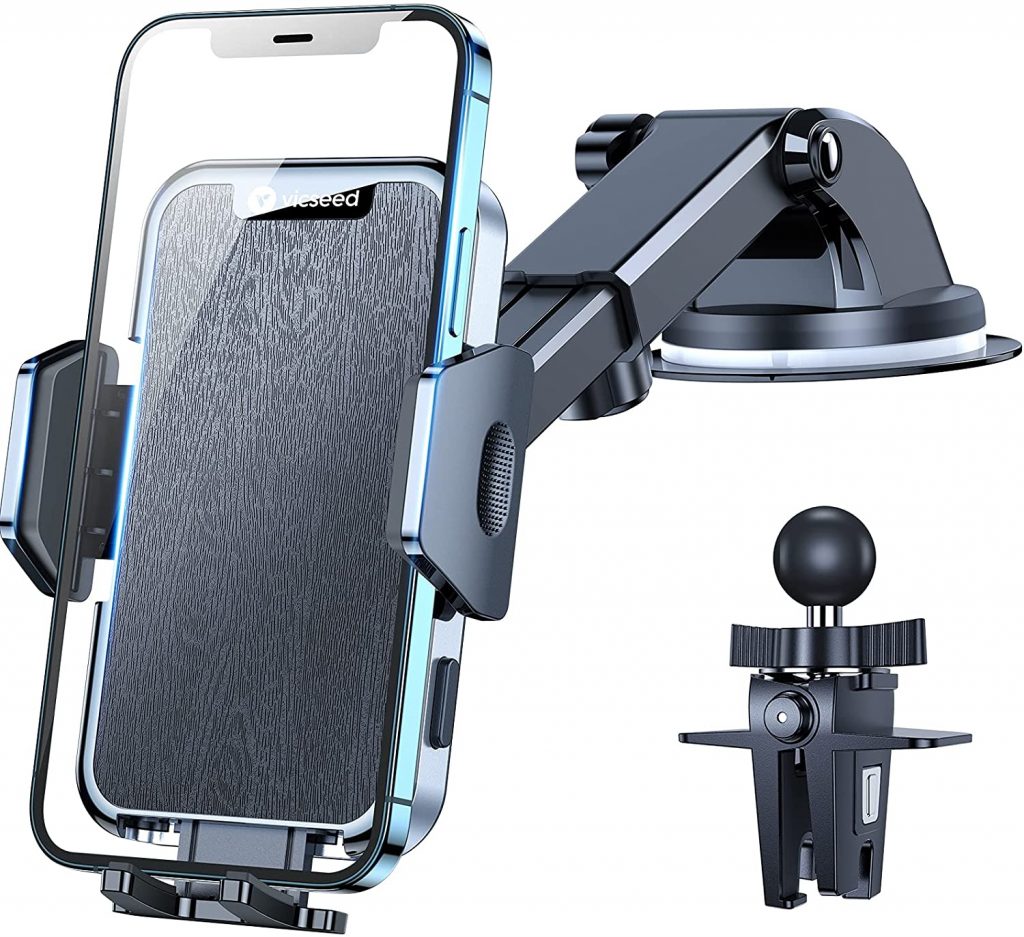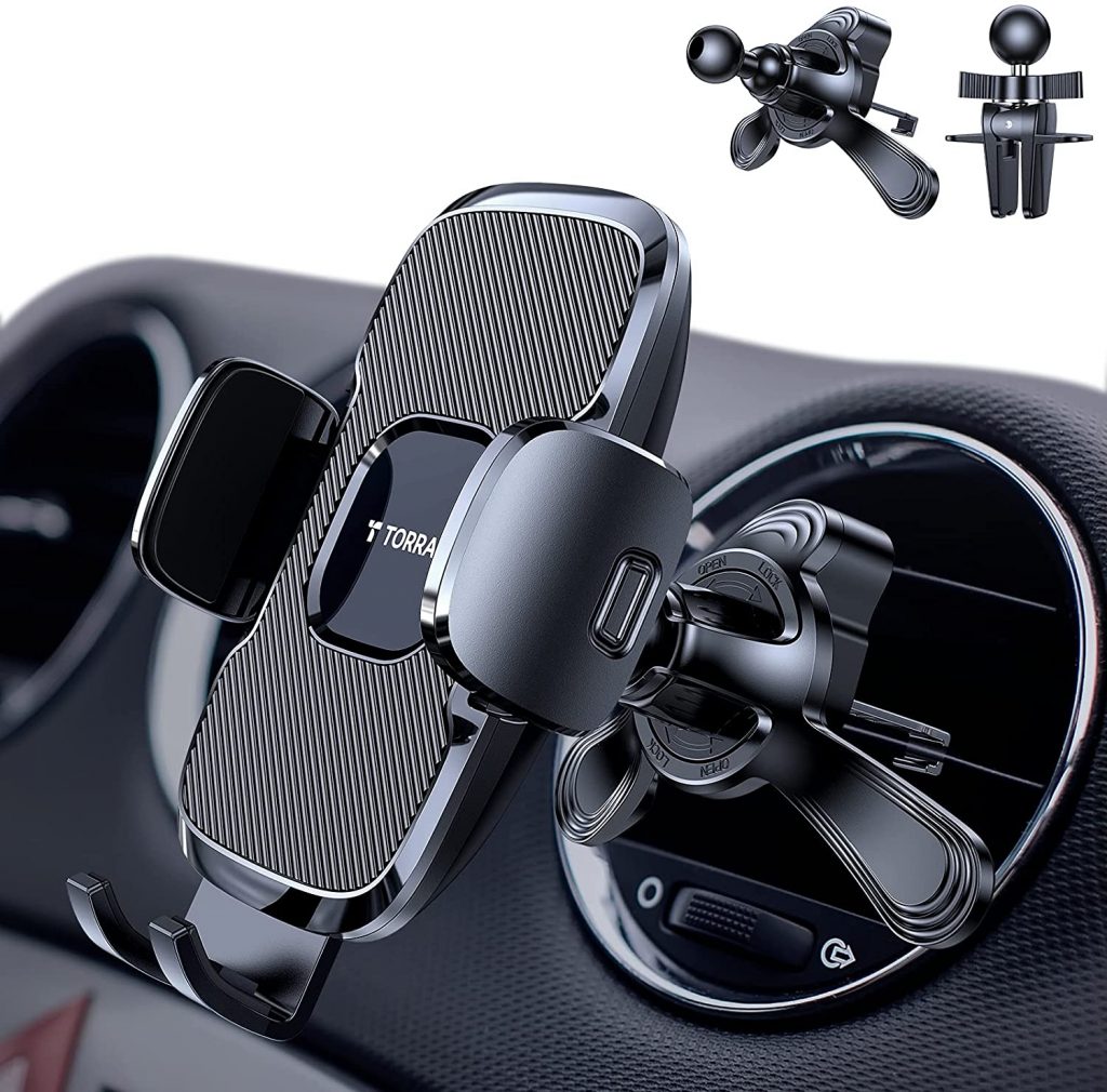 This phone holder comes with two types of mounts one is universal and the other is for the horizontal vent. The widened wrapped arm makes it easy to hold more phone sizes. It has a quick-release button and adjustable clamp arms to mount the phone with tightened grip.