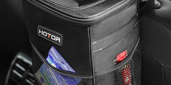 7. HOTOR CAR TRASH CAN WITH LID AND STORAGE POCKETS: