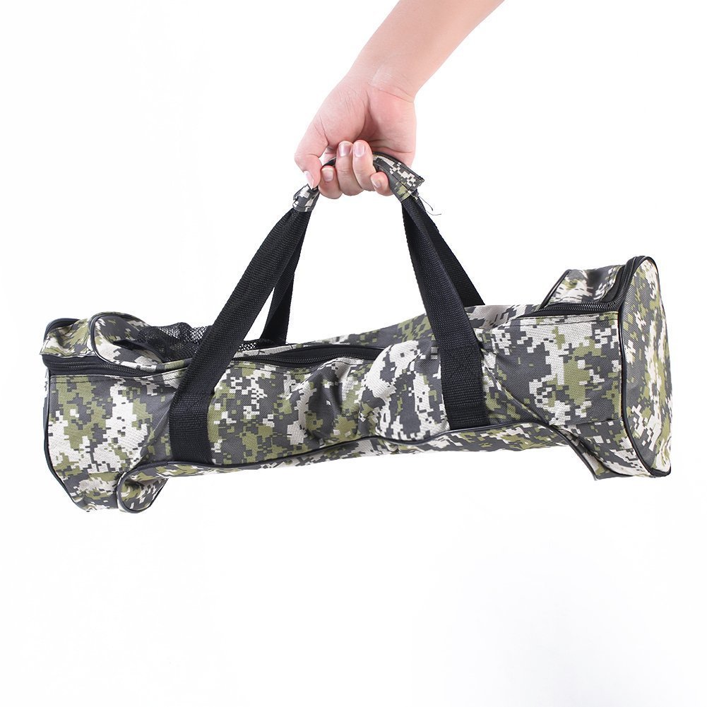 一个体面的手提袋设计自平衡滑板车有6.5″直径以下的车轮。它的特色是迷彩设计,让它看起来与众不同,但如果他们有更多的拉链或口袋,我们会更感激它。