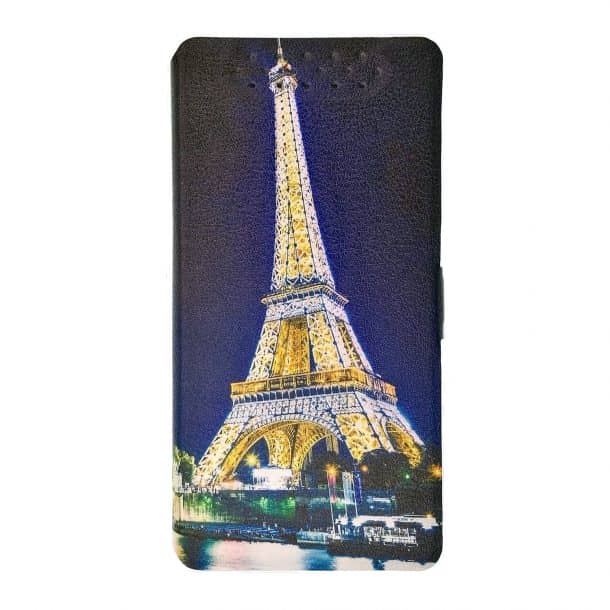 这也是一个全覆盖对开风格翻盖盒由欧街通,是由优质的PU皮革制造。襟翼转换成支架,免提和景观观看。你可以用可重复使用的3M胶带粘你的智能手机。埃菲尔铁塔将长久地印在箱子上。