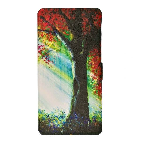 这是一个全覆盖翻转盖壳Note 5A,保护前面和后面的设备。精确切割为所有手机的功能。你可以用可重复使用的3M胶带粘你的智能手机。享受一个宁静的树在树林里的景观,明亮的UV油墨印刷在一个PU皮革封面。