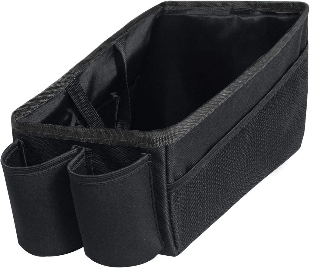 这个收纳器将所有的必需品都放在一个地方,让你的车变得整洁;可选的分隔器创建两个较小的隔间。它有两个外部网眼袋和六个内部滑袋装小物品。集成杯架保持水瓶和饮料安全。