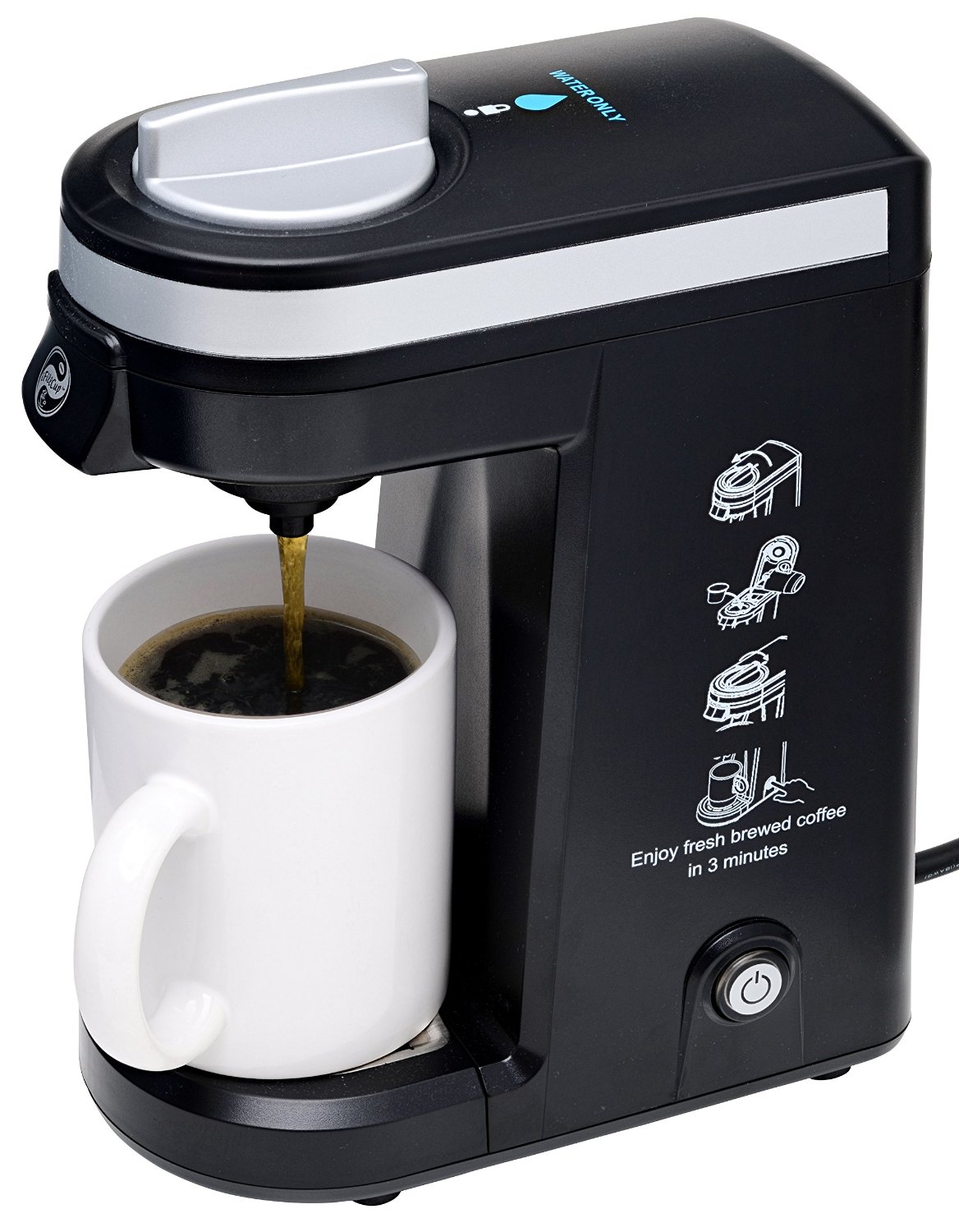 该机器具有光滑,紧凑的设计,可在桌子或台面上节省空间。该产品带有18盎司的杯子,重6.5磅。制造商指出,“只需将水加到可移动的水箱中,将您喜欢的咖啡添加到可重复使用的金色调过滤器中,然后按开始酿造即可。无需豆荚。透明
