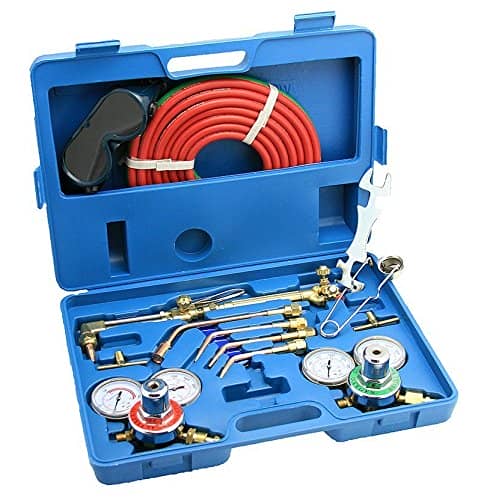 这割炬工具包是一个中型Victor-style机器,非常易于使用。它是轻量级的,能够切割金属到4英寸厚。它可以焊接到1/2英寸金属与可选的技巧。它有一个火炬处理两个不锈钢针形阀的快速和准确的火焰调整。