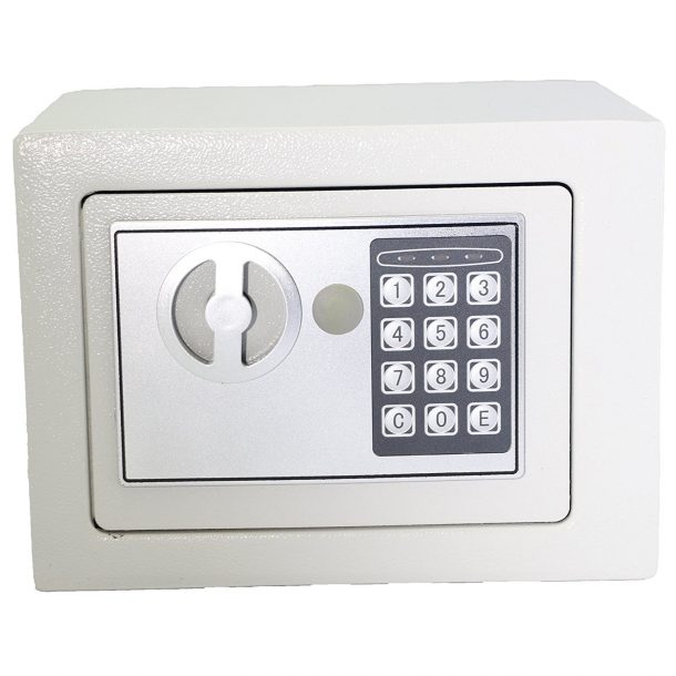 这是一个数字锁定保险箱,配备了一个易于编程的数字键盘,可以通过输入安全组合轻松锁定和解锁。它有两个紧急钥匙,可以立即进入。这个迷你保险箱有一个加强实心钢墙结构。它的双重安全钢门,锁定螺栓和耐腐蚀和耐污染的粉末涂层,确保最大的耐久性。它配有自动电磁锁。