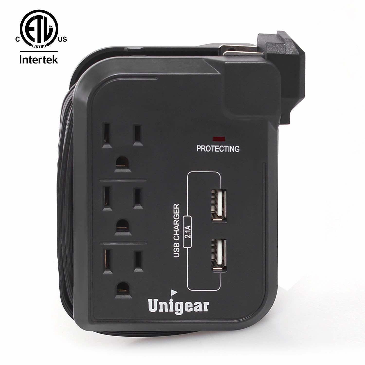 这些延长线有3个交流插头和2个USB 2.1 A端口。电源线有28英寸长,电涌保护器可以承受300焦耳的能量。