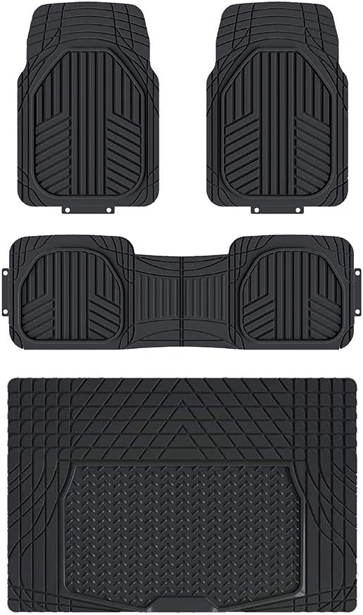 这四件套四季橡胶地垫保护您的汽车地板从污垢和碎片;一个深的托盘设计可以装水、雪、泥和盐。这些耐用的橡胶聚合物垫可以承受从零下到100多度的温度,而不会卷曲、开裂或硬化;增高的鞋跟垫可以抵抗磨损。