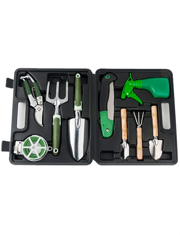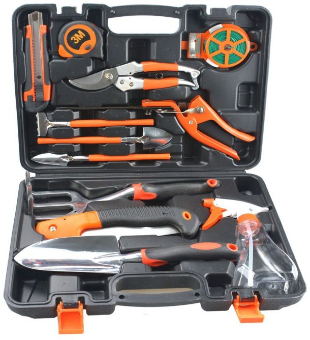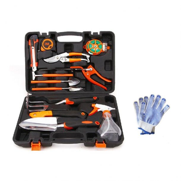 这个家庭园艺工具的工具是由重型不锈钢能够经受住时间的考验。他们不生锈或休息。这些工具使园艺任务像挖、除草、放松土壤,移植,浇水,锯,切割、测量和修复植物更容易。模压工具箱有锁定设计更容易和你方便存储工具。这个包包括一个修枝剪、修枝剪、修剪,喷雾瓶,捻领带刀,三个铝铲子、两个花园耙,一把工具刀和一个卷尺。