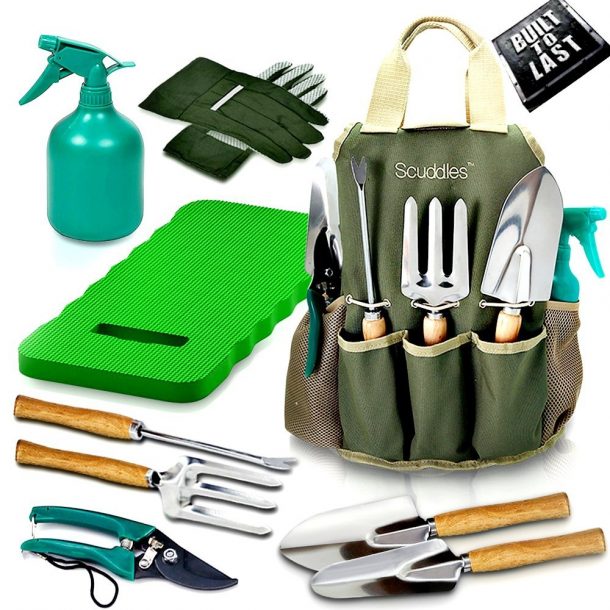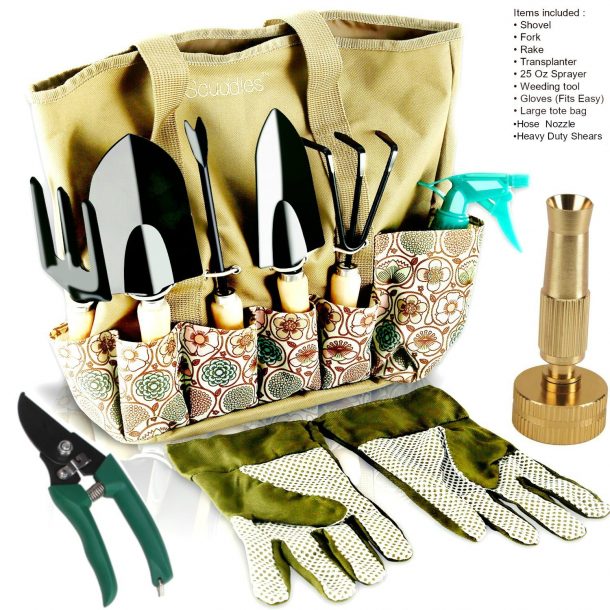 这个家庭园艺工具包包括工具由高质量固体抛光铝不腐蚀或随着时间慢慢变淡。这个工具箱包括一把铁锹,耙,叉,除草工具,25 oz花园喷雾器和一双园艺手套。每个工具提供其用户体验。它还提供了一个很软跪垫,有助于减少膝盖疼痛当你跪下来工作。这个工具也给你一个大手提袋聚酯制成,并且有多个口袋。