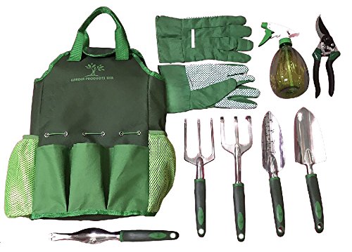 这个家庭园艺工具的工具是由高质量的铝不生锈或腐蚀。这个套件包括一把铁锹等工具,耙,叉和除草工具。它还附带了一个25 oz花园保持你的植物和鲜花水分喷雾器。为您提供一个无应变的工具有舒适的握工作经验。工具袋子给你一个安全的存储位置的所有工具。