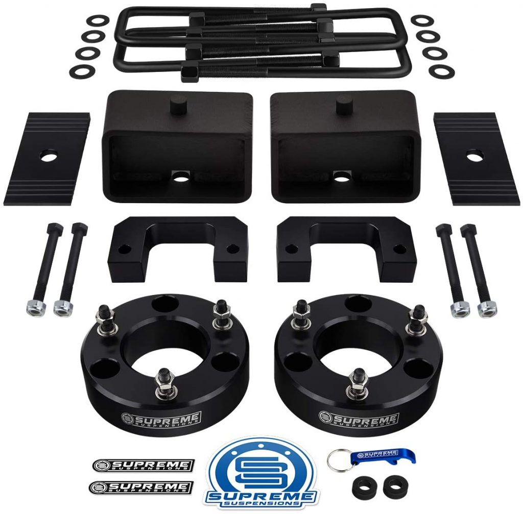 Supreme悬挂提升套件包括上部支柱垫片,提升锥形块,底部支柱垫片,u型螺栓,安装硬件,轴对准垫片,和安装说明。它提升了高达3.5英寸的前和3英寸的后。虽然安装Supreme悬挂电梯套件需要3到5个小时,但它的强度和耐用性使其值得。升降机套件增加了较大的轮胎的地面间隙,同时改善您的汽车的外观。然而,请记住,提升高度与间隔层厚度不是1:1的比例。