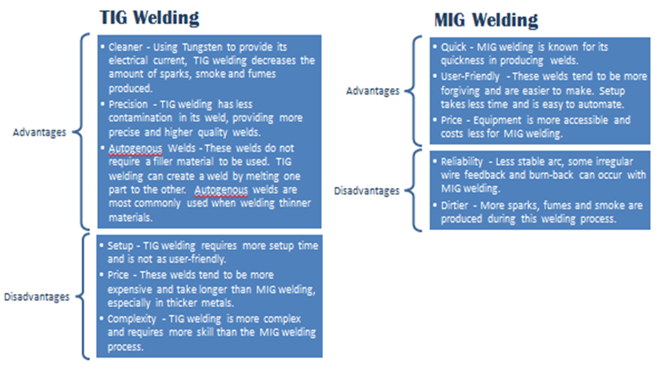 主要是有两种基本类型的焊接TIG和MIG。TIG焊接通常用于精确的工作,并且很复杂,而MIG焊接易于设置,并且可以焊接较厚的仪表。下图显示了该过程中的核心差异。