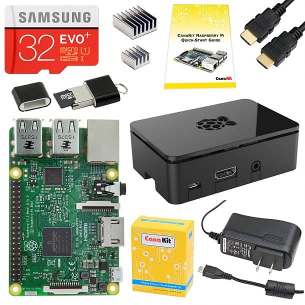 这树莓π3工具包提供了你一个USB电源滤波器包括USB电缆和噪音。它有一个1 GB内存,一个模型B四核和1.2 GHz处理器。已通过UL认证。它还包括一组两个散热片和CanaKit快速启动指南。