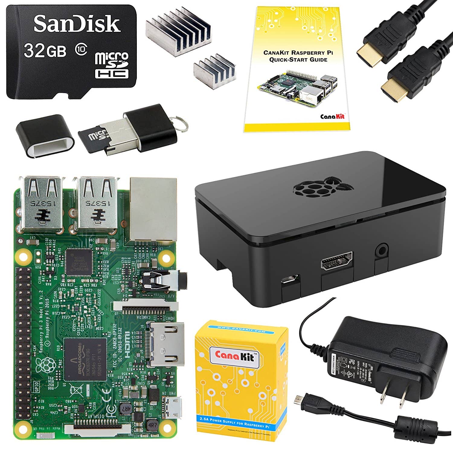 覆盆子π3工具包是一个完整的工具包32 GB记忆卡,1 GB内存,一个四核1.2 GHz处理器,内置WiFi和蓝牙连接。这是一个ul标准工具包优质6.5英尺HDMI电缆,散热器和CanaKit全彩快速启动指南。