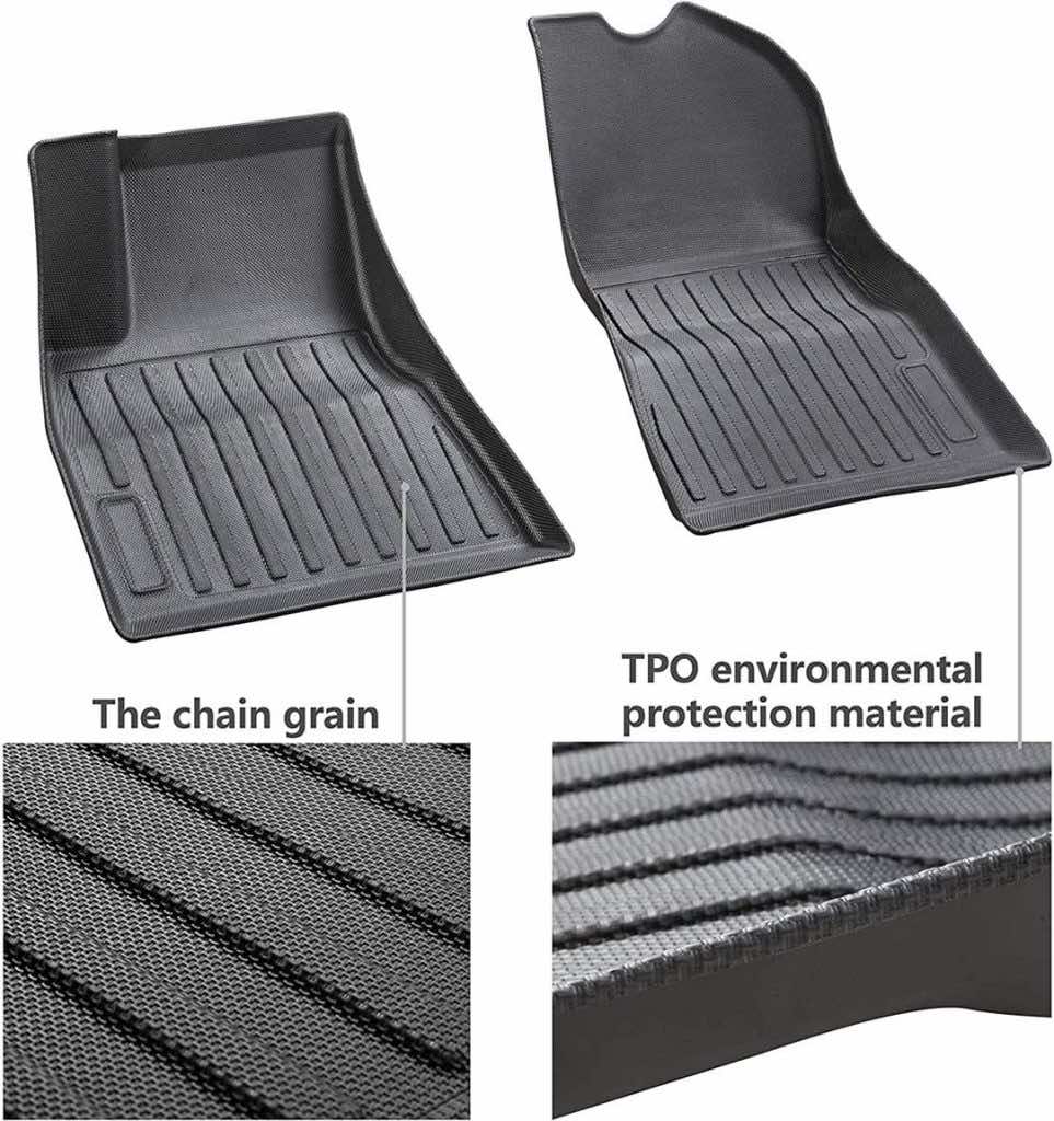 AUXITO 3D汽车垫特斯拉Model Y 2022 2021 2020。他们确保一个完美的适合没有风险卡住刹车和油门踏板;防滑背,固定夹和链纹。三种设计防止脚垫滑动,为您提供安全舒适的驾驶体验。它们由纯TPE材料制成。与市场上其他含杂质的TPE材料相比,100%无臭,具有更好的耐磨性,不会开裂变形。特斯拉车主可以安全地把宠物放在车里。