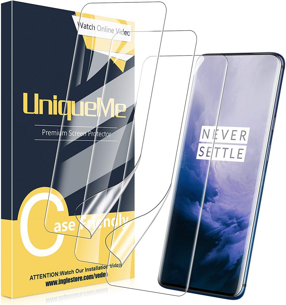 接下来,我们有这个由UniqueMe为OnePlus 7T Pro制造的屏幕保护膜。这款屏幕保护膜由柔软、灵活、坚韧的军用级热塑性聚氨酯制成,旨在吸收冲击,抗划伤、刺穿和紫外线。它还具有湿式安装方法,允许皮肤重复使用和重新应用。