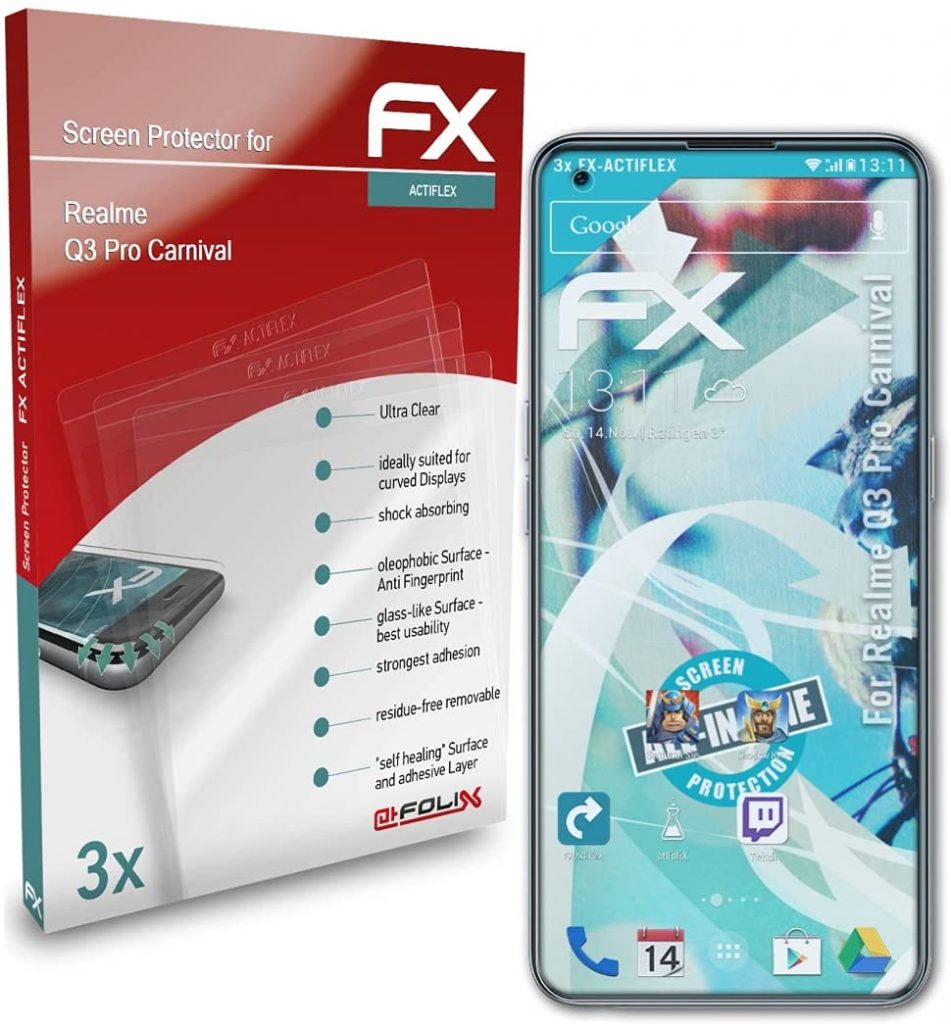 Realme q3 Pro嘉年华列表上的下一个选项是atFoliX屏幕保护器。优质钢化玻璃外壳是减震和灵活。它是高度透明的,并有一层油,很容易防止指纹。相机镜头盖带有一个附加的盖子,不会干扰其他情况。它可以让镜头在撞击时更加安全。硅胶外壳一旦使用,就会挤出气泡,不会留下任何残留物。