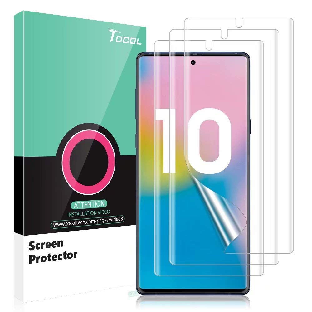 接下来,我们有TOCOL为三星Galaxy Note 10制造的屏幕保护膜。这款屏幕保护膜是由优质的9H钢化玻璃制成的,耐划伤和防碎,保护你的屏幕免受从划伤到高冲击滴的一切。它还有防油涂层,可以让你的屏幕上没有指纹和油渍,而且很容易清洁。