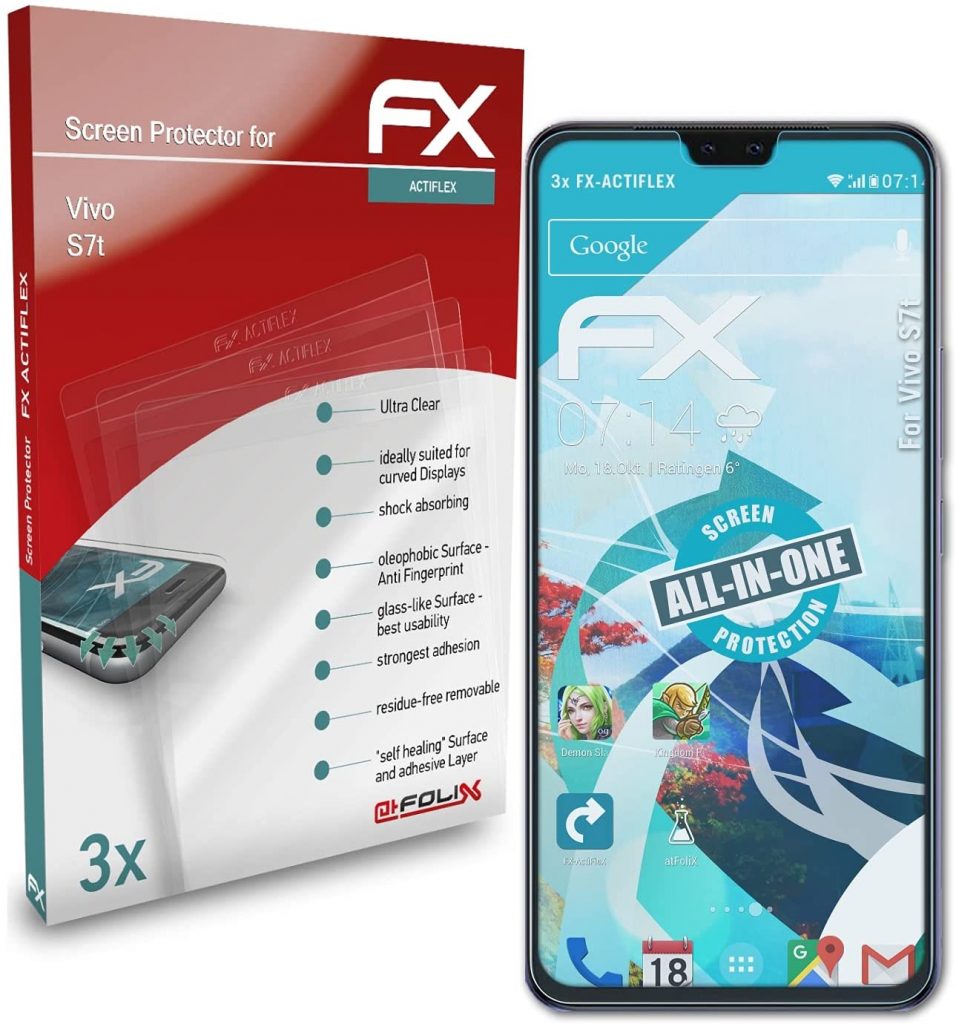 接下来,是ATFOLIX FX-ACTIFLEX屏幕保护器,用于VIVO S7T。这种晶体清晰的高度透明的屏幕保护膜几乎看不见,铅笔硬度为6小时,在500g写入压力下,非常耐刮擦 - 耐刮擦,硬涂层的保护膜与Vivo S10 Pro相容。薄膜耐用,多层合成材料为针对各种损坏的屏幕提供了长期的机械保护。
