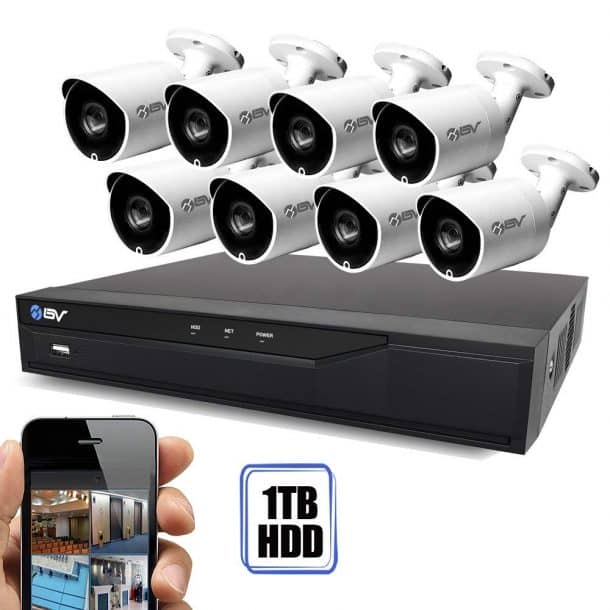 这个安全摄像系统包括四个1080 p高清防风雨的相机。这个安全系统提供您清晰图像的自动IR-cut过滤器。它还支持夜视高达100英尺,有一个安全、防止风吹日晒雨淋。这个系统有1 TB的硬盘驱动器允许它保持与USB存储备份记录。你可以看到所有你的相机在一个地方免费应用ZOSI视图。