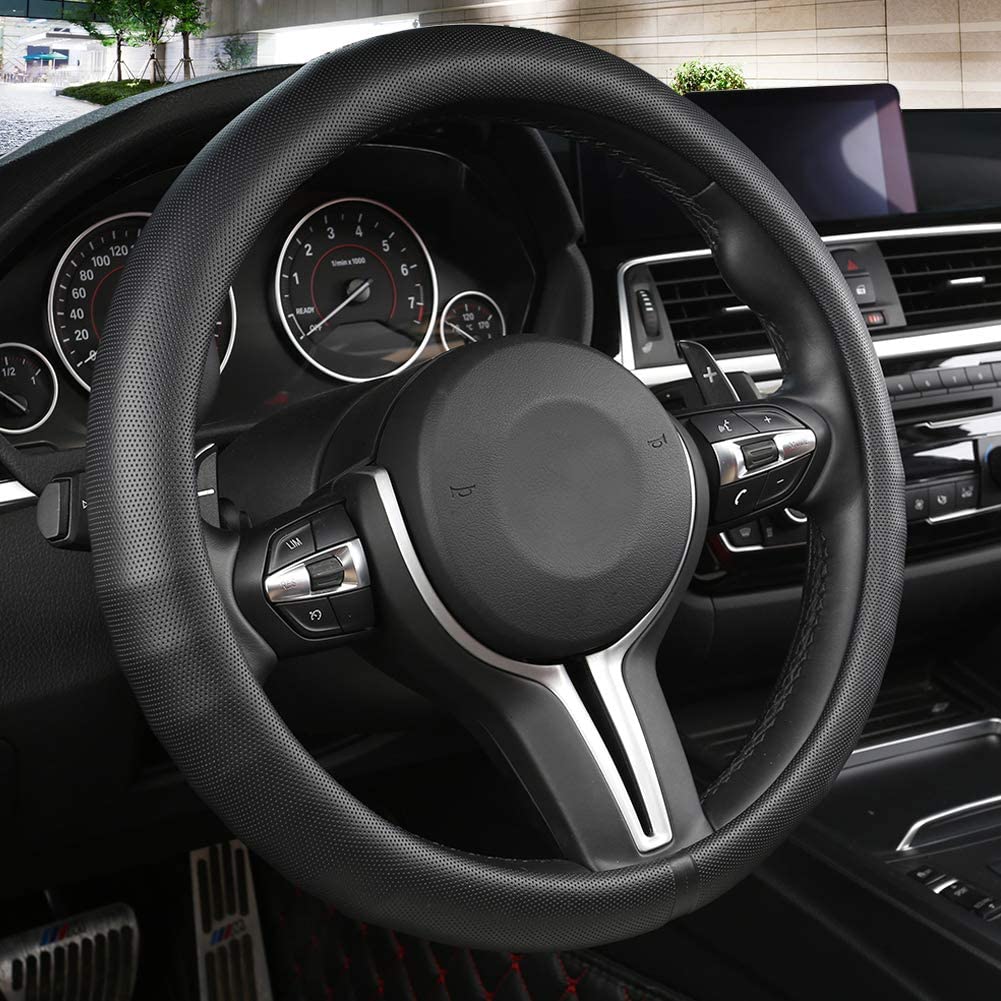 2. Alusbell超细纤维皮革方向盘盖透气汽车汽车方向盘盖男士通用15英寸黑色