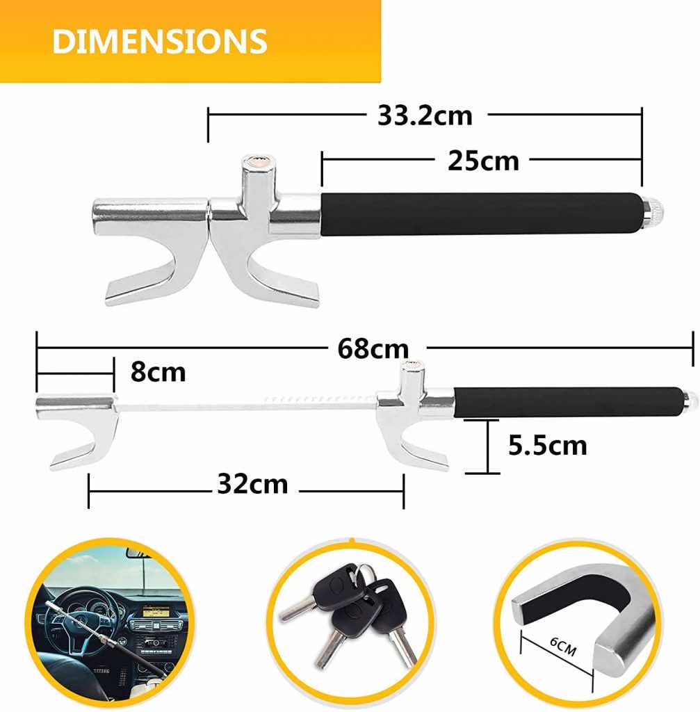 这些方向盘锁有橡胶涂层,保护您的车辆的方向盘,而在使用。它有一个可调节的设计,适合大多数品牌和型号。这把锁的最大跨度是27.5英寸。这些锁当完全扩展的总长度为28.5英寸和折叠到21英寸的总长度。