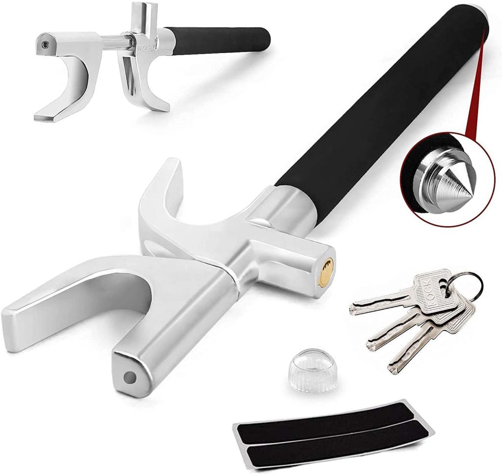 汽车方向盘锁由铝合金和碳钢组成,其强度远高于普通钢。两个锁杆的中间宽度为3.3英寸,它们从底部到顶部锁定方向盘。