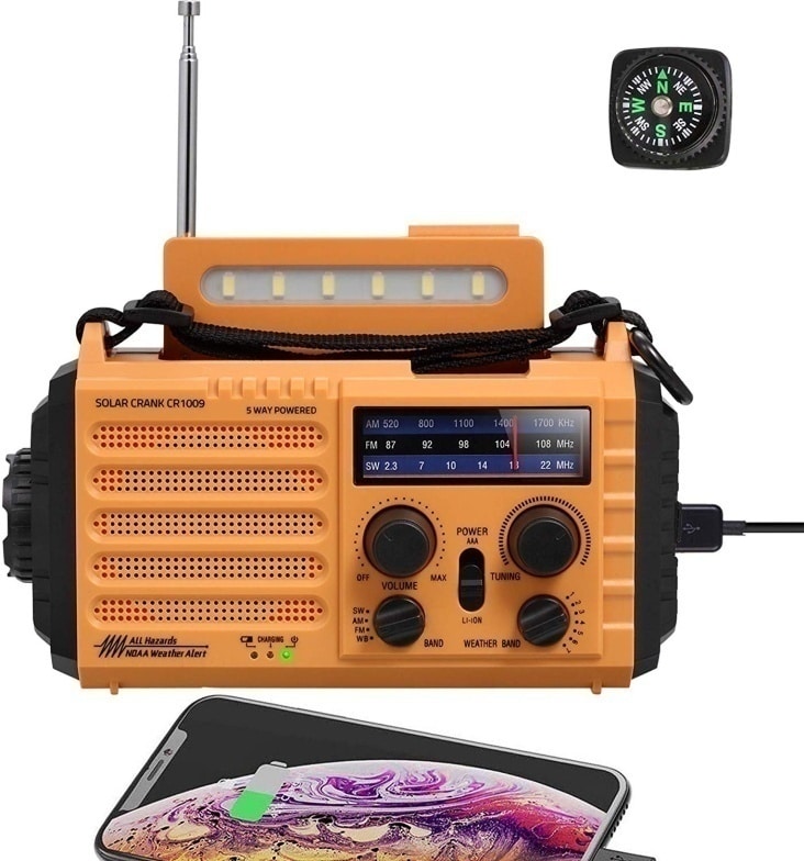 除了收音机,它还有指南针,以确保你不会迷路,在遇到麻烦时有紧急报警系统,一个不像手电筒那么亮的阅读灯,可以连接FM/AM和持续的天气警报,让你对气候状况有所了解。