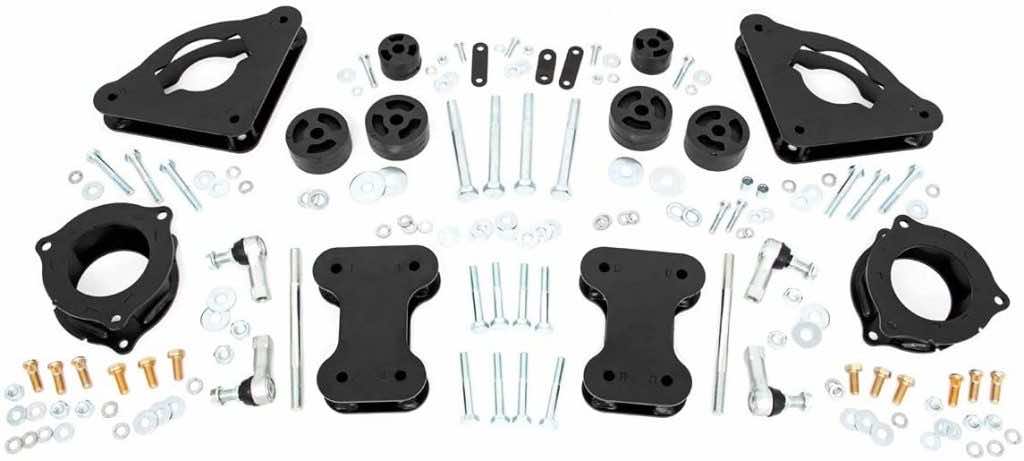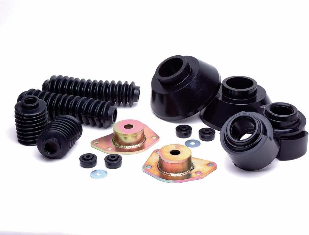 Renegade Lift套件包括2个前进步率聚氨酯弹簧圈垫片,2个后进步率聚氨酯弹簧圈垫片,2个前摇摆杆端链接,2个后控制臂支架,和硬件。