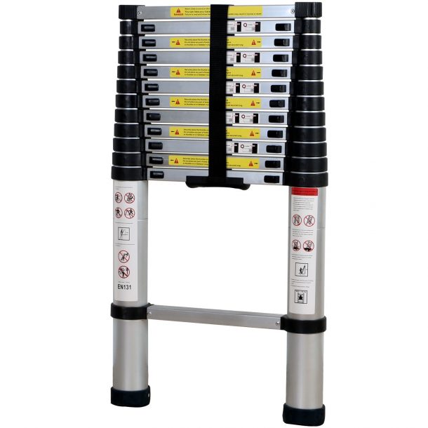 这款可伸缩的梯子可以延伸至12.5英尺,并配有锁定功能,以提高安全性。这是一架重量很轻的梯子,仍然可以承受330磅的重量。它也可以在75度角上使用。为了增加安全性,你可以在每一步都用两个锁销锁住梯子,当梯子打开时,锁销会自动弹起到位。它是欧洲安全标准EN131, CE和SGS认证的梯子。