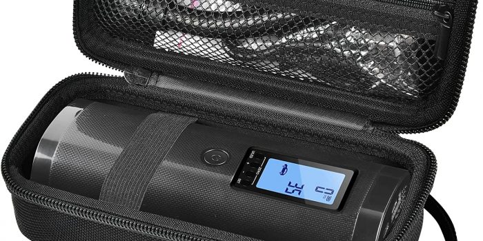 这种无绳空气压缩机是由硬EVA材料,防水,防刮,防震。这对自行车气泵盒子外观光滑,没有凸起,不伤手。如果意外下降,这样对于一个气泵能有效吸收冲击,减少损失。用软,轮胎充数码持有人有双重保护,保护轮胎充便携式空气压缩机从灰尘,污垢,影响和划痕。