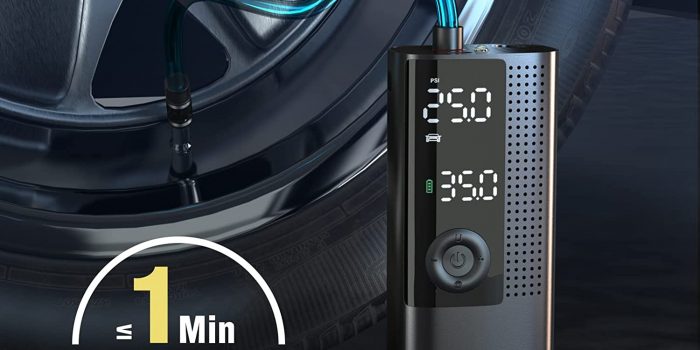 This compact car tire air pump and air compressor has a high-performance motor that can pump up a standard car tire from 0psi to 36psi within 6 minutes. It also has a power bank that allows the pumping of multiple vehicle tires simultaneously.