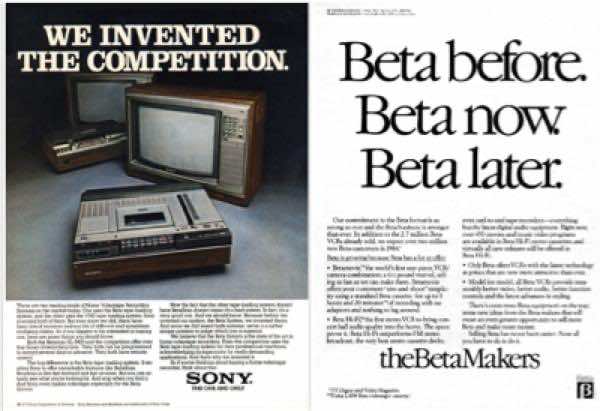 该测试版是一个较小,更耐用的盒式磁带,比JVC竞争的VHS格式提供了更好的分辨率,甚至将VHS击败了美国和日本市场一年多。但是索尼不愿许可该技术是Beta失败的主要原因之一。爱游戏ayx体育除此之外,与Beta的60分钟相比,VHS允许记录3个小时。