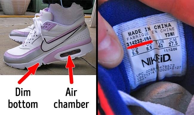 这双鞋有一个空气模块在透明的塑料外壳下,但假的只有塑料外壳。你可以按一下塑料来检查空气,原来的塑料很难推进去,但是很快就会恢复原状。舌头标签是热连接的,所以没有拼接,它有一个6个字符的代码作为序列号,然后有三个字符的颜色代码。的唯一的是由稍微变暗的口香糖制成的。