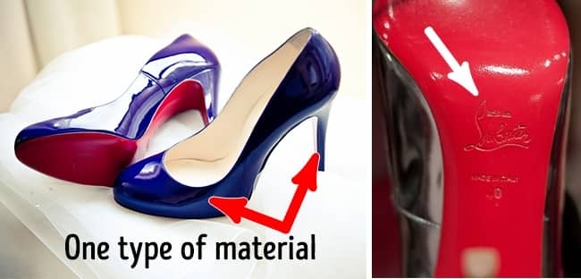当你把鞋子放在不平坦的地面上时,脚趾和脚跟会在同一水平线上。鞋跟和侧面部分有明显的曲线。主鞋的布料和鞋跟是一样的。的唯一的始终是明亮的红色,是清晰和完整的,中间没有补丁。有邮票显示“克里斯蒂安·鲁布托”,“意大利制造”和尺寸。皮革模型有时会有额外的“Vero Cuoio”字样,以及“Christian Louboutin”字样。