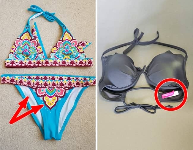 维多利亚的秘密泳衣总是用布的两倍。他们进来了五种不同的尺寸XS, S, M, L和XL但是假的只有S M和L。标签只有粉红色、黑色、白色或透明。都是制造在中国或斯里兰卡。