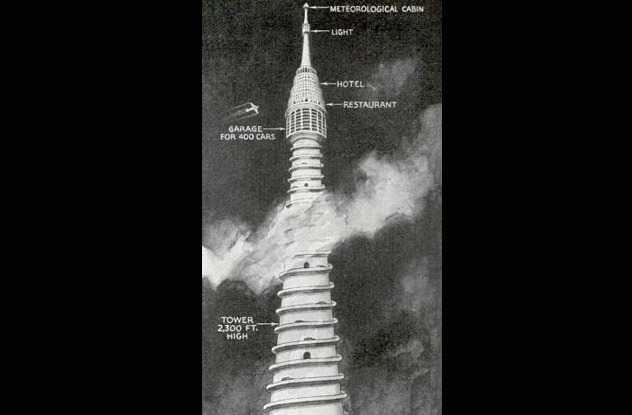 这个高700米高的塔楼被提议于1937年在巴黎安装,就像汽车理发杆一样。塔的顶部将是一家酒店,人们可以通过沿着塔上旋转的道路来达到它。顶部将安装400辆汽车的停车场,车库和酒店之间将有一家餐厅。单轨系统会缓慢地将汽车放到底部。该建筑物疯狂,幸运的是从未完成。