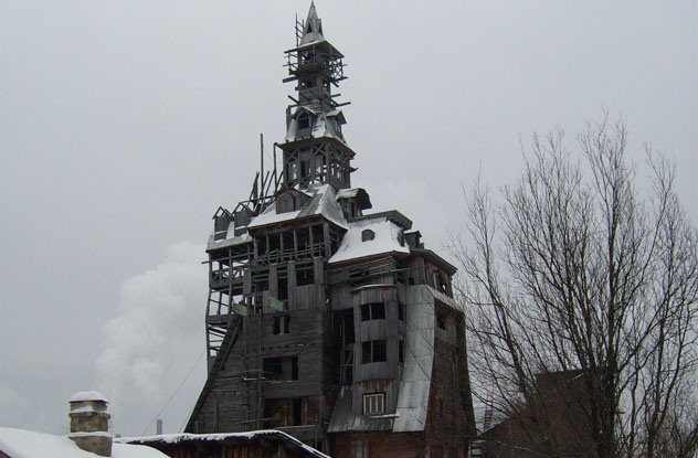 1992年,尼古拉·苏达金(Nikolai Sutyagin)想增加他的房子的外观。但是,他的项目导致了主要结构的不断增加,直到房屋成为144英尺的世界上最高的木屋。唯一能够阻止苏餐的修改的唯一一件事是入狱之旅,这使他没有资金。一旦他返回,他就无法再添加到建筑物中,并被官员们告知要删除使建筑物造成火灾危险的额外补充。Sutyagin起初并不符合统一,而是被迫拆除高耸的结构,仅留下原始建筑物和照片作为其遗产。