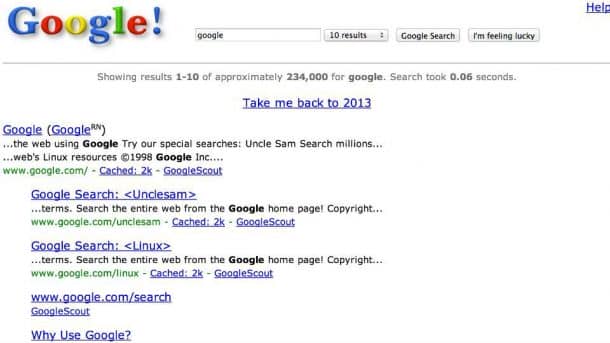 这是你的机会去回忆。你搜索“Google在1998年”的搜索引擎它发射升空时的样子几乎二十年前。