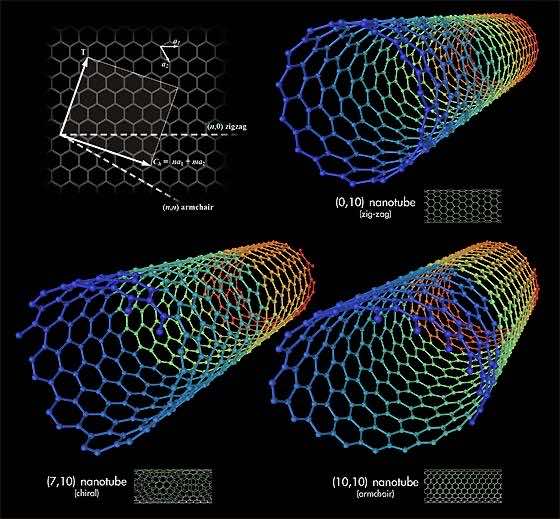 碳纳米管是由sp2键连接在一起的长碳链,sp2键是化学中最强的键。这些纳米管有许多惊人的物理特性。纳米管能够进行弹道电子传输,这使得它们非常适合电子领域的应用。碳纳米管的特定强度是钢的300倍。这使得它们非常适合建造数百公里高的塔(比如太空电梯)。