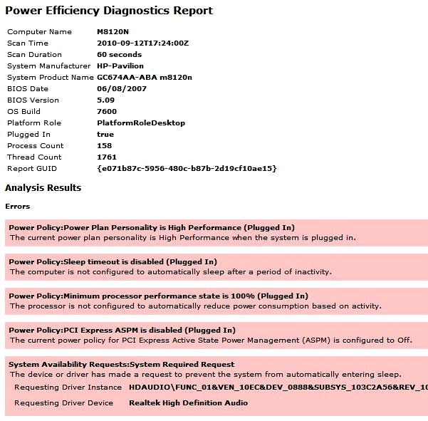 这将导致扫描您的系统,60秒后,一个名为energy-report.html的文件将被创建在\windows\system32文件夹中。在打开它之前,你必须将它复制到其他地方,一旦打开,它将显示哪些设置或设备正在块走电源或打乱电源配置。
