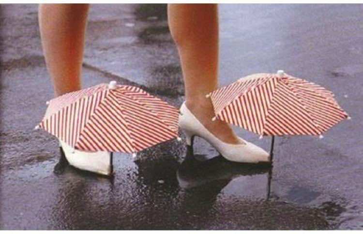 鞋伞的目的是显而易见的。它的设计目的是防止下雨时的脚弄湿。但是,用两个雨伞挂在鞋子上的想法,以及它给它带来的不便是毫无意义的。