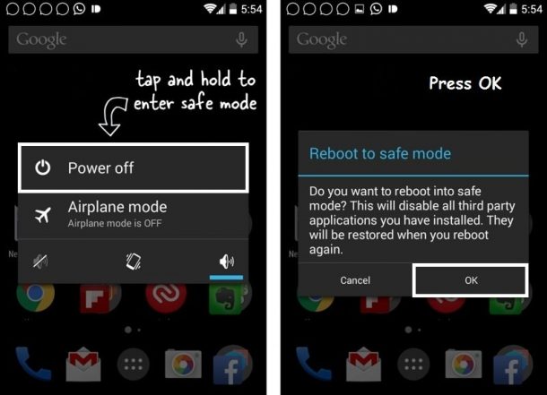 您的常规电话操作有时可能会被第三方应用程序中断,因此您可以通过启用安全模式来调试手机。打开手机,再次按下电源按钮,并保持一会儿。菜单将出现在您按下并按下“关闭电源”键的地方,然后将出现安全模式选项。