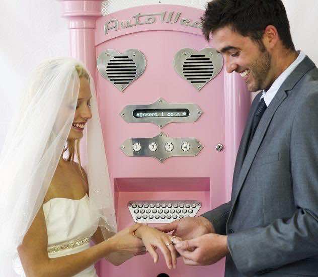 Autowed是一台自动售货机,提供模拟婚礼,其中包括音频提示,一对戒指,甚至是印刷结婚证书。两党只是输入他们的名字,机器向他们宣布男人和妻子(为了娱乐)。